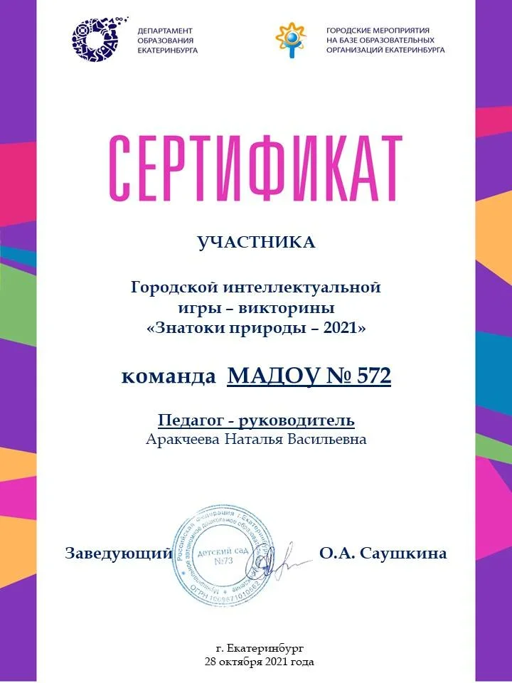 2019 год, "Технологии оказания услуг ранней помощи по развитию общения и речи, познавательной активности у детей с 3-х лет", 02.09.2019 - 27.09.2019 72 часа, ООО "Межрегиональный институт дополнительного образования"2019 год, "Технологии реализации услуг ранней помощи детям и семьям в организациях системы образования", 10.09.2019 - 19.09.2019 72 часа, "Уральский государственный педагогический университет"